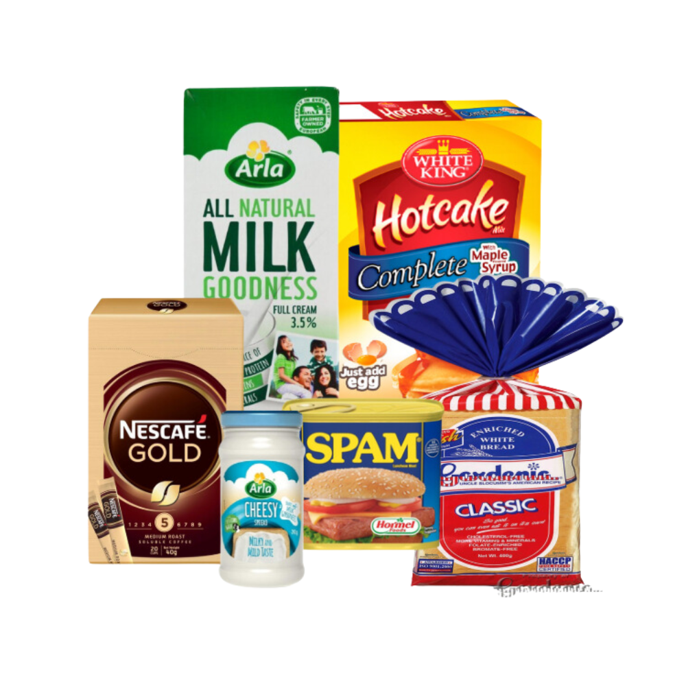 Start your day off right with the Breakfast Essentials, featuring everything you need for a delicious and hearty morning meal. From fluffy hotcakes with syrup to creamy spreads, freshly brewed coffee, and a side of classic Spam, this bundle covers all your breakfast cravings. Paired with milk and bread, it’s the perfect way to fuel your day!